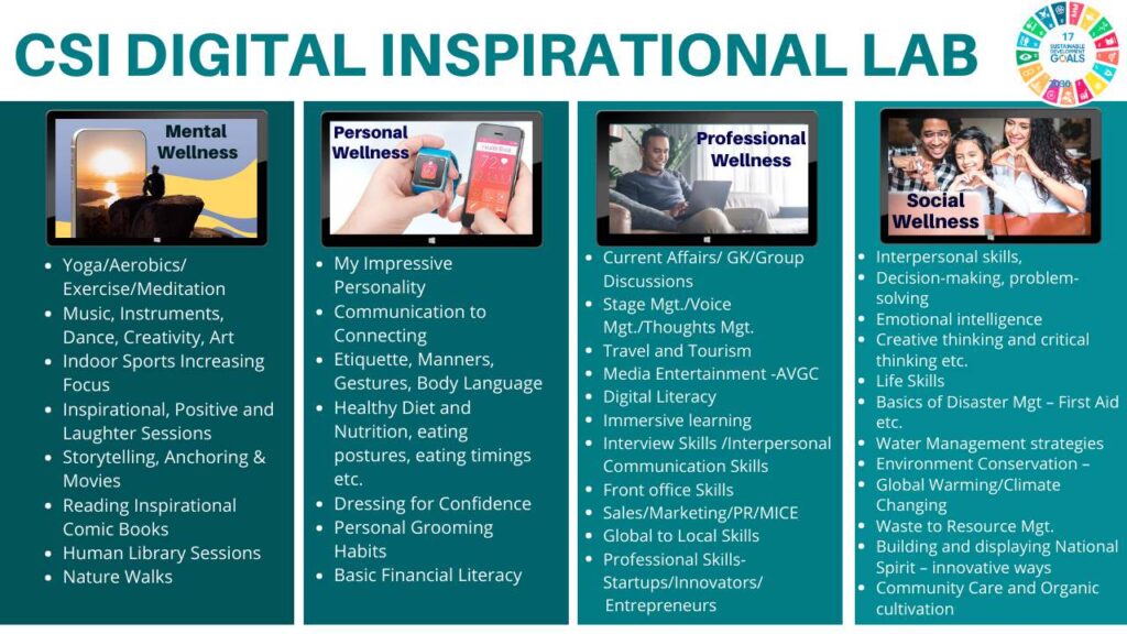 Our flagship initiative, the Digital Inspirational Lab (formerly the Finishing School), emerged as a powerful evolution during COVID. Operating through online and hybrid models, it serves as a hub of inspiration, innovation, and skill development, offering training programs, workshops, mentorship, and digital resources for educators and young professionals across industries.